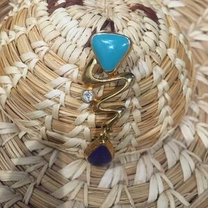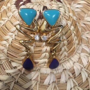 1.75 inch long unique 80’s retro dangle earrings. Blue gold.