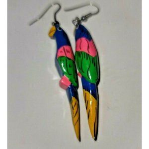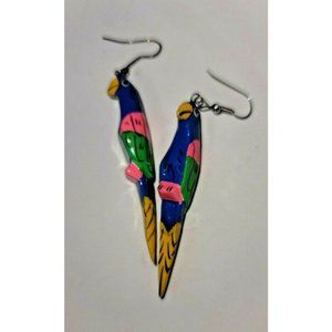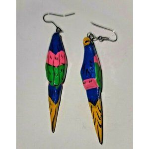 Dangle Wooden Parrot Earrings Handmade Carved & Painted 3" Tropical Birds Set