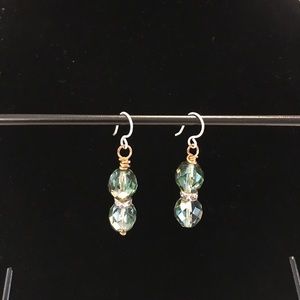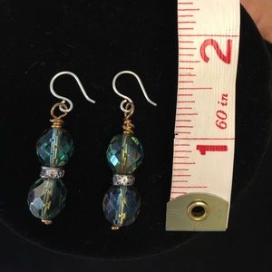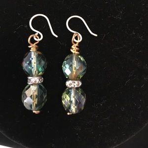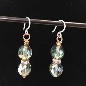 These pretty earrings have green beads separated by a loop with clear crystals. Nickel free wires. Earrings are two tone, silver and gold. Smoke free home. No trades.