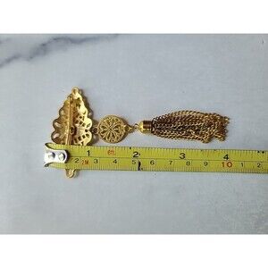 This is a vintage gold tone metal dangling charm tassel brooch.