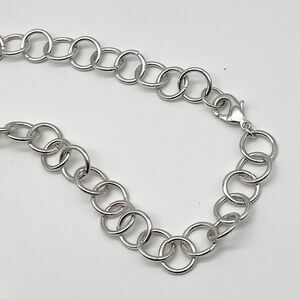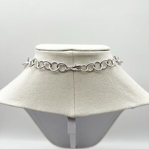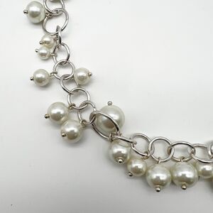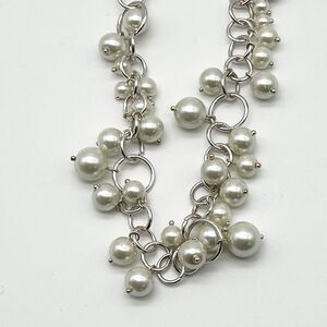 Alternating size circle loop chain in silver tone with clusters of alternating size dangling white faux pearls.