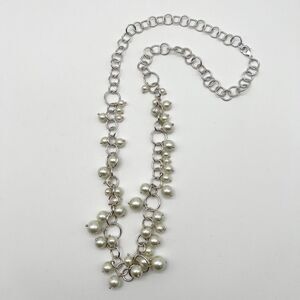 Dangling White Faux Pearl Cluster Silver Tone Circle Chain Fashion Necklace 29”