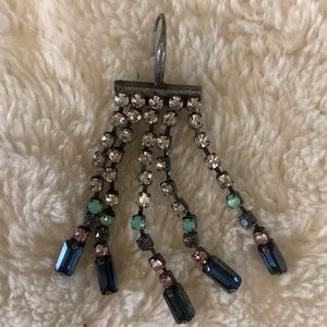 Black-tone with multi-colors including clear, turquoise, purple, pink. Open hook closure with stoppers. A little over 2” long