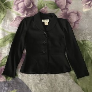 Size 4 Petite, women’s blazer in excellent condition. Previously worn but still looks and feels just like new. Made from polyester and spandex. Comfortable and soft. Has shoulder pads for elegant look. 3-button closure.