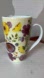Gorgeous and cheerful Danica (Now Designs) "Adeline" porcelain mug featuring yellow and purple flowers like pansies and poppies on a light yellow background. This is a tall, extra-large coffee or tea cup that holds about 20 fl. oz.