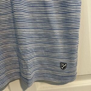 Stylish short sleeve tee with blue and white stripes. Ideal for casual outings. Soft and comfortable fabric.