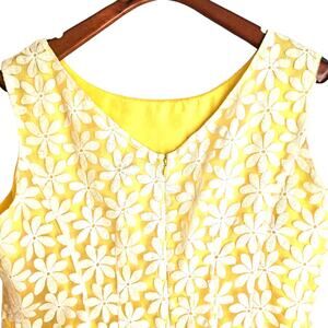Daniel Cremieux Embroidered Yellow & White Daisy Flower Mod Sheath Dress. Features white embroidered daisy flowers overlaying a yellow sheath dress, rounded neck, darts on the front & back, and zipper closure.