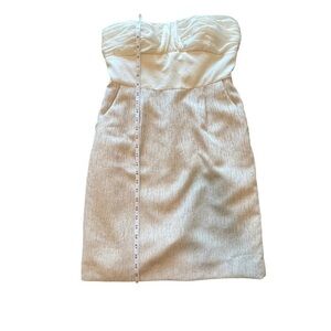 Excellent condition Daniel Cremieux Gathered Bust Sheath Dress. Fully lined and has pockets! Adjustable straps and ivory top. Bottom is fitted with a pretty light brown / tan color pattern and texture. Back zipper closure. Shell: 100% polyester. Lining: 100% acetate. Measurements in photos. Wonderful gathered bust sheath style dress from Daniel Cremieux!