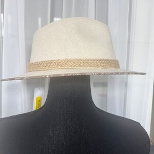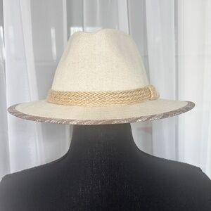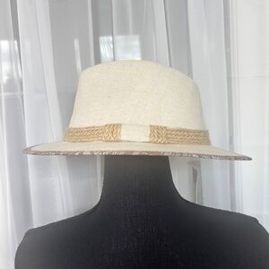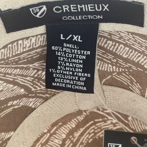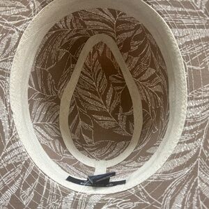 Daniel Cremieux - completed this fedora hat inside as well as the outside. OutInside cream color hat is made with polyester & cotton with a linen rayon nylon lining braided band and has a seam of the same lining as used in the inside - is completely lined with a cotton fun beach theme palm leaves - never worn NWT