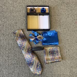 Elevate your formalwear with this comprehensive Daniel Ellissa accessory set. This multi-piece collection provides everything needed to add a final touch of polish and sophistication to a suit or tuxedo. Featuring a coordinated necktie, bow tie, pocket square, and lapel pins, this set allows for versatile styling options, ensuring a dapper and put-together look for weddings, business events, or any formal occasion. A perfect all-in-one solution for sharp, classic accessorizing.