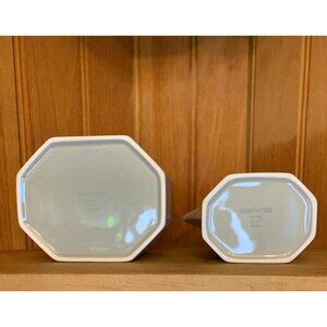 This vintage sugar and creamer set was created by French Designer, Daniel Hechter. It is an octangular shape and brings a touch of elegance and sophistication to your table setting. The gray and green ceramic pieces is color named, "Camo Clay" created by the designer and are both functional and stylish.