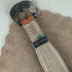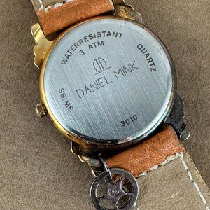 Daniel Mink Swiss Wild West Watch 925 Sterling Silver Bezel Accents & Clasp 3010. Water Resistant 3 ATM, Brand New fresh battery. Take a close look at the Original Tan strap. See pics. Marked .925 Italy on Clasp, Strap loop and Tip. UNISEX.see pictures