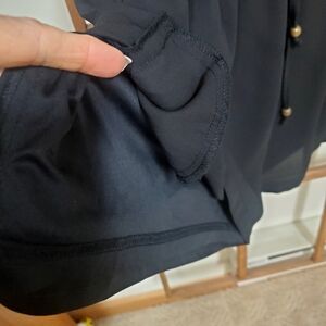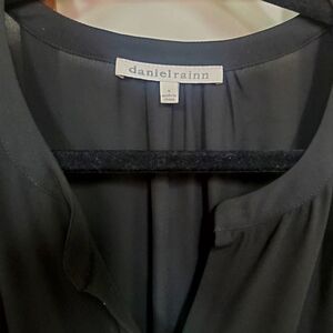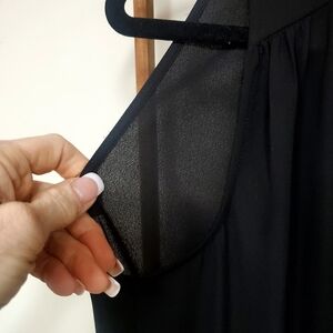 Daniel Rainn size S, black, sleeveless romper. This polyester garment has a sheer top with covered buttons and an open V neck. The shorts are lined and a true gathered waist allows you to adjust the fit. From shoulder to hem, 33 1/2 ", not accounting for gathered waist and blousing effect. From waist to hem is 14 ". In great condition.