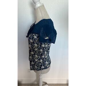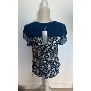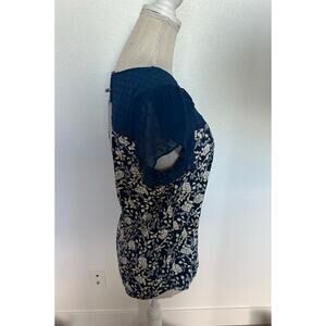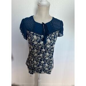 This gorgeous top is perfect for your spring looks. It features a beautiful blue and white floral pattern. It is a flutter sleeve style with a tie at the neckline. The sleeves are accented by a swidd dot material. This lightweight piece is perfect for layering. New with tags.