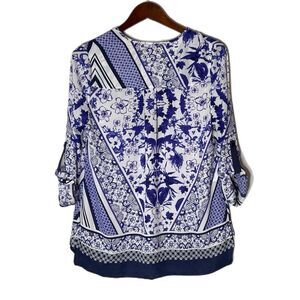 Daniel Rainn Blue White Floral V Neck Roll Tab Sleeves Tunic Blouse