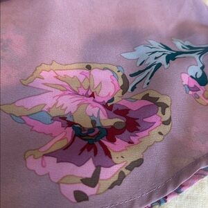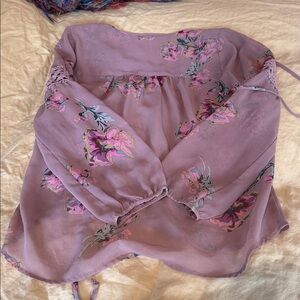 Beautiful pink Ish floral blouse with lace details blouse is shared requires an undershirt or bra. Fun hippie style nice detail details excellent preowned condition one owner me free smoke free home if you have any questions just ask.