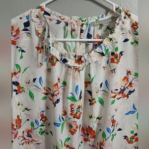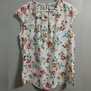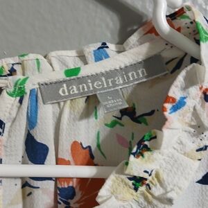 This elegant blouse by Daniel Rainn features a charming ruffled design with a bib collar, crafted in a soft cream and pink palette. The cap sleeves add a delicate touch, making it a perfect choice for a stylish and sophisticated look.