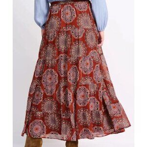 Daniel Rainn Demeter Metallic Tiered Maxi Skirt Red Medallion size XXL, sold through Stitch Fix. Maxi length. Maroon red color with medallion print and metallic threading. Tiered. Button front. Detachable tie belt with tassel ends. Lightweight chiffon fabric. Elasticized back waist. Lined. Pre-owned with no flaws.