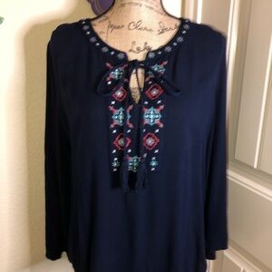 Gorgeous navy blue top with embroidered Aztec looking designs on the front of shirt