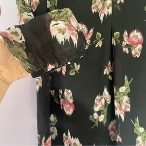 Black long sleeve v-neck blouse with a pink floral pattern. Body of the shirt is lined & the sleeves are semi-sheer. Back features a v cutout.
