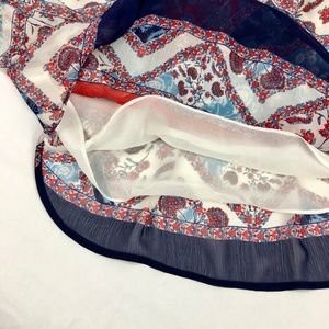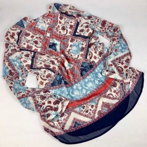Daniel Rainn long sleeved floral tunic, Button up chest with pleated detail. Detailed floral and geometric pattern. Lined. Flowy bottom and slight high low hem detail. Navy blue, light blue & pink/coral. Size Medium.