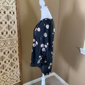 Brand & Style: Daniel Rainn bohemian-inspired blouse in black with scattered pink/white pom pom floral print—split-neck V-detail and subtle button front for a flowy, romantic vibe that's effortlessly artistic.