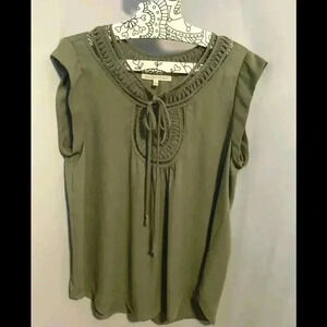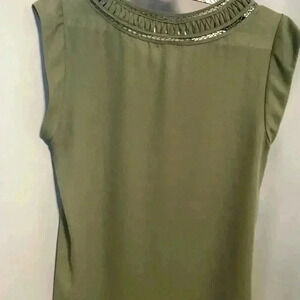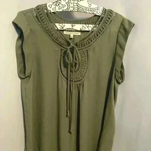 This is a shortsleeved pretty green blouse. It’s 100% Polyester.