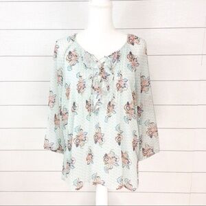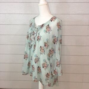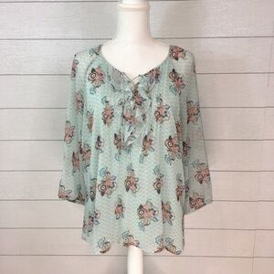 Semi sheer polyester fabric of soft blue printed with pink and blue flowers. 3/4 length dolman sleeves. Ruffle at front and lace up detail. Fully lined through body.