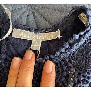 Add a touch of bohemian chic to your wardrobe with this navy jersey top from Daniel Rainn. The top features a round neckline with 3/4 sleeves and a pullover closure for easy wear. The pleated and embroidered accents add a pop of color and texture, while the crochet detailing gives it a touch of whimsy. The lightweight and breathable rayon fabric makes it perfect for summer, fall, and spring. This blouse is perfect for travel, casual outings, or even business meetings. It is a basic style that can be dressed up or down. The solid pattern in blue adds a colorful vibe, making it suitable for a preppy or bohemian theme. This top is brand new with tags, and it is available in a petite size.