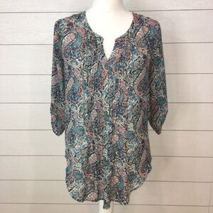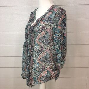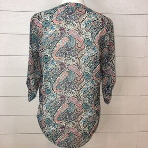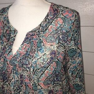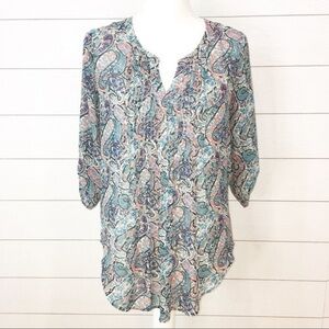 Rolled sleeves with tabs to secure, notched neckline. Pin tuck detailing at front. Semi sheer polyester fabric is printed with a floral paisley in shades of blue and coral. Item comes with attached white camisole.