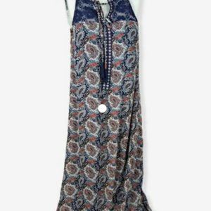 blue lace on the top, empire waist, maxi dress with blue slip underneath. blue tassels hang from neckline, lightly worn.