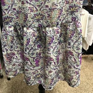 Split front tunic blouse with tassel tie at neckline. Crochet detail with button closure in front. Note: must be worn with a tank or cami underneath. Perfect for casual summer attire. Light ruffling at bottom; feminine and flirty.