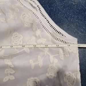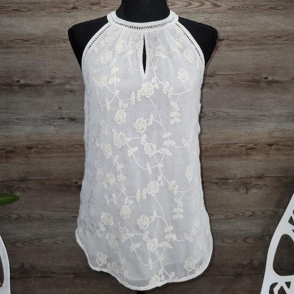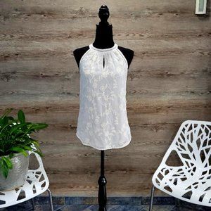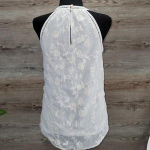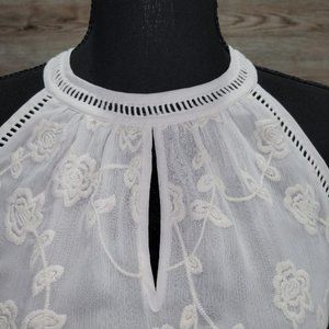Beautiful, off-white, Daniel Rainn Halter top with embroidered overlay. Easily paired with skirts or trousers for work or jeans for play. Worn lightly. In excellent shape. Size XS runs large. 100% polyester.