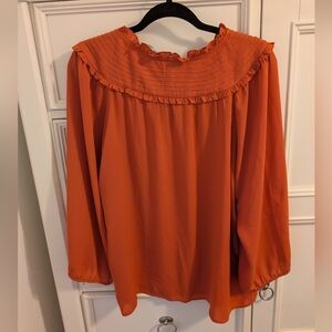 Chic orange blouse with elegant ruffles. Ideal for versatile styling. In excellent condition and from a smoke free home