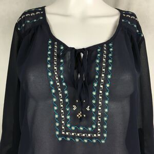 Daniel Rainn Womens Navy Blue Embroidered Chiffon Roll Tab Sleeve Tunic Top - semi sheer, you will need to wear a cami under.