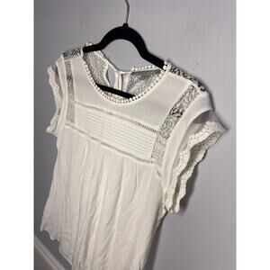 Item Description: White pullover blouse with crochet trim and cap sleeves