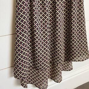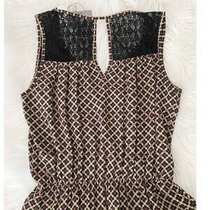 Sleeveless geometric dress with a retro tan, pink and black print. Features a elegant lace accent panel along back and shoulders. Elastic stretch waist, flowy skirt featuring a high low hem. Has a back cut out accent. Dress is lined.