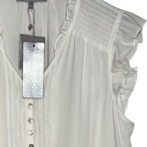 NEW with tag Stitch Fix Daniel Rainn sleeveless white v-neck blouse with ruffle trim at the sleeve and neckline. Button accents down the front and smocking on the shoulders. Size Large.