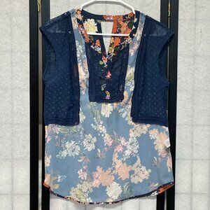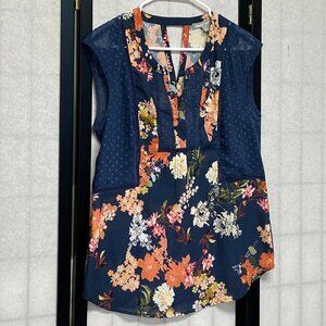 Sleeveless Sheer Banded Arm Yoked Top from Daniel Rainn. Lovingly worn - looks like new. Lightweight sleeveless top with a flowy relaxed silhouette in solid navy Swiss dot and coral floral print. V neckline yoke with gathers at bottom. Solid blue inset sleeve band and back side. Ladder like lace trim next to all navy sections. V opening in back is closed by neckband. Pullover style with curved hem. Hits below hips.