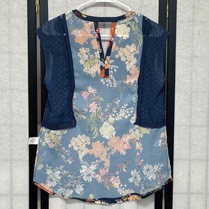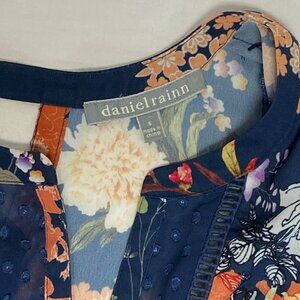 Daniel Rainn V Neck Sheer Keyhole Back Dot & Floral Top Navy Orange S Sleeveless