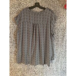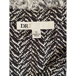 This Daniel Rainn blouse in size 4X features a geometric pattern in black. It has a V-neckline and short sleeves, suitable for casual or semi-formal occasions. Made in China, this women's blouse is regular size. The item is pre-owned. Keywords: Daniel Rainn, blouse, 4X, black, geometric, V-neck, short sleeve, women's, casual, semi-formal, China, pre-owned, regular size, plus size.