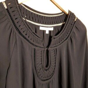 Danel Rainn women’s black flowy blouse with boho neckline small. Good condition. Measurements are: 24 ½" sleeve (measured from neckline), 27” from shoulder to hem, and 19 ½" from armpit to armpit.
