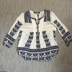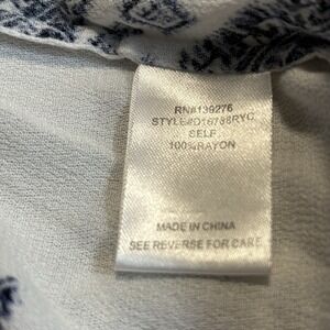 Daniel Rainn semi sheer blue and white boho bohemian blouse with embroidery-like print. A very light and gauzy rayon - really pretty. Pintuck detailing on the front.
