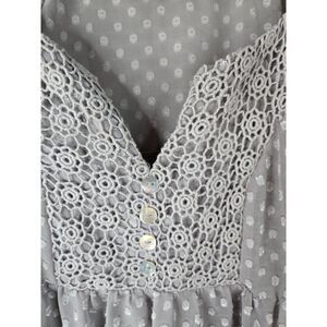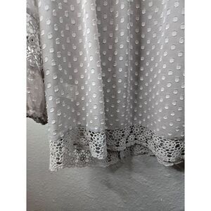 Daniel Rainn Women's Gray Swiss Dot Long Sleeve Sheer Blouse. V-Neck with faux button detail. Floral Crochet Details on Neckline sleeves and hem. Lightweight. Relaxed, Long Fit. Elastic sleeve cuffs. 100% Polyester. Casual. Festival. Fall. Cottage. Boho. Tunic. Workwear. School. Y2K. Pit to Pit: 20.5"; Length: 31" (measurements approximate). Size Medium. Excellent Used Condition.