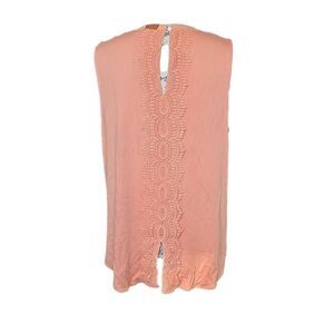Embrace light and feminine style with this lovely Daniel Rainn blouse! This size large top comes in a soft peach color, beautifully complemented by crochet detailing. The delicate combination creates an elegant, airy look perfect for warm-weather dressing or a chic casual outfit.