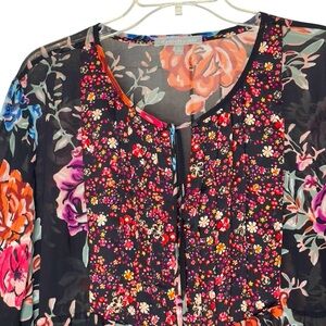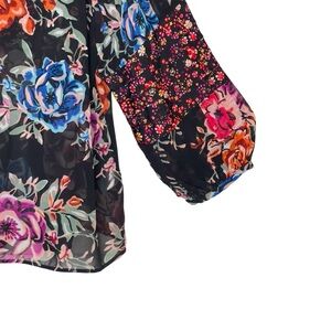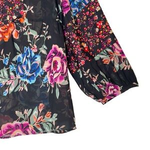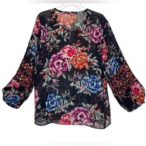 Daniel Rainn XXL black sheer boho blouse with vibrant floral print, long puff sleeves, and tassel tie neckline. Perfect for layering and casual-chic style.
