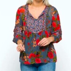 Daniel Rainn blouse, XXL floral top, blue boho blouse, sheer peasant blouse, tassel tie top, 3/4 sleeve floral blouse, plus size boho top, lightweight blouse, festival blouse, casual chic top