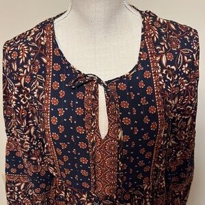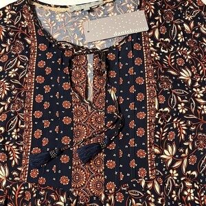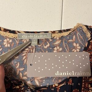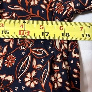 Daniel Rainn peasant style blouse in navy with orange and beige florals. Cord Tie at neck. Bib yoke with gathered fabric at base. 3/4 sleeve with fullness and elastic at cuff. Soft 100% rayon with noted fabric care. Size medium with pit to pit shown . New with tag. Really cute. Would keep if my size