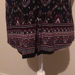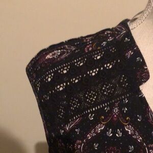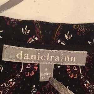 Daniel Rainn sleeveless top with navy embroidered lace over shoulders. Vee neck ending with a small pleat. Hem slightly rounded print on navy has varied colors of mauve, gold, white, rust. Small, nwot