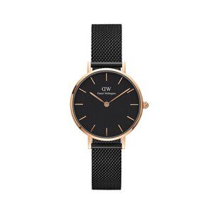 Elegant Daniel Wellington watch with a black face and mesh strap. Features rose gold accents.